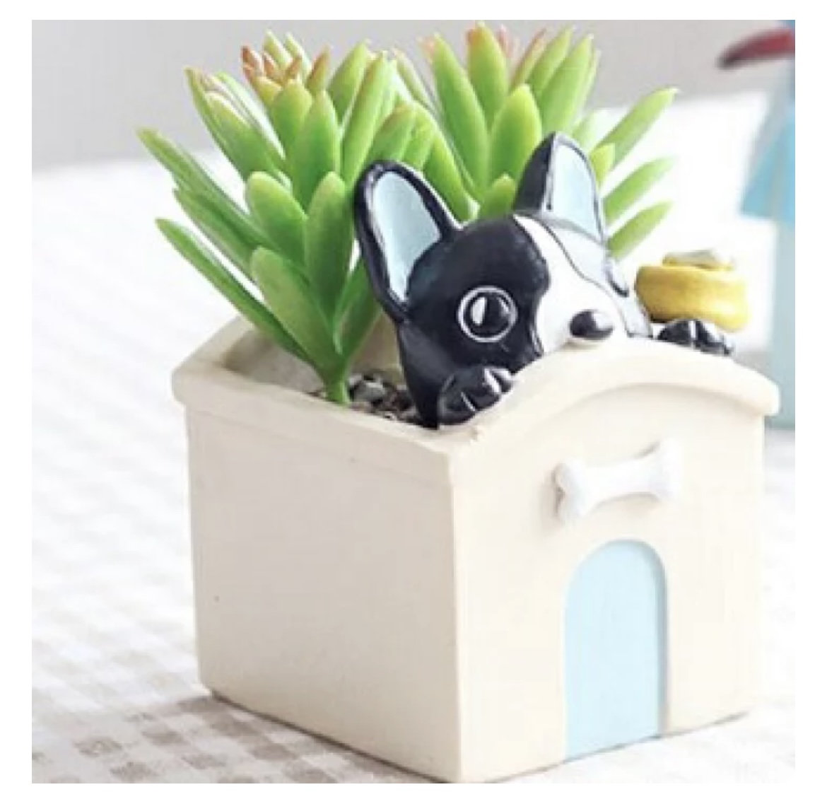 可愛いボストンテリアがこちらを覗いている、ミニサイズのフラワーポット(植木鉢)です。